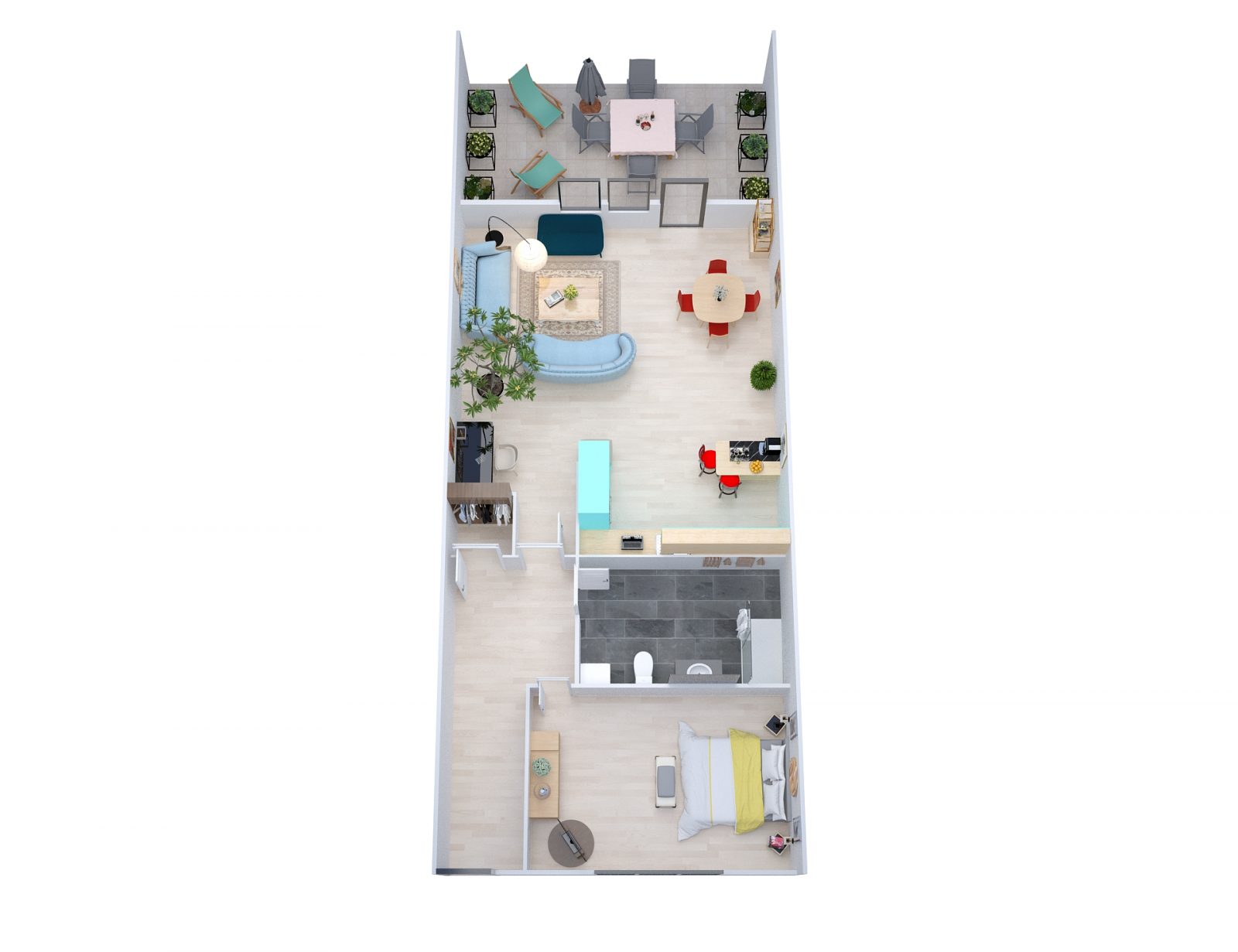 Het appartement heeft een ruime woonkamer met een open, volledig uitgeruste keuken, een zithoek met bank en fauteuils, een eethoek en een studieruimte. Er is ook een tweepersoonskamer met een bed van 160x200, een televisie, een Bluetooth-speaker en een doucheruimte (grote douchebak) + wastafel + WC.